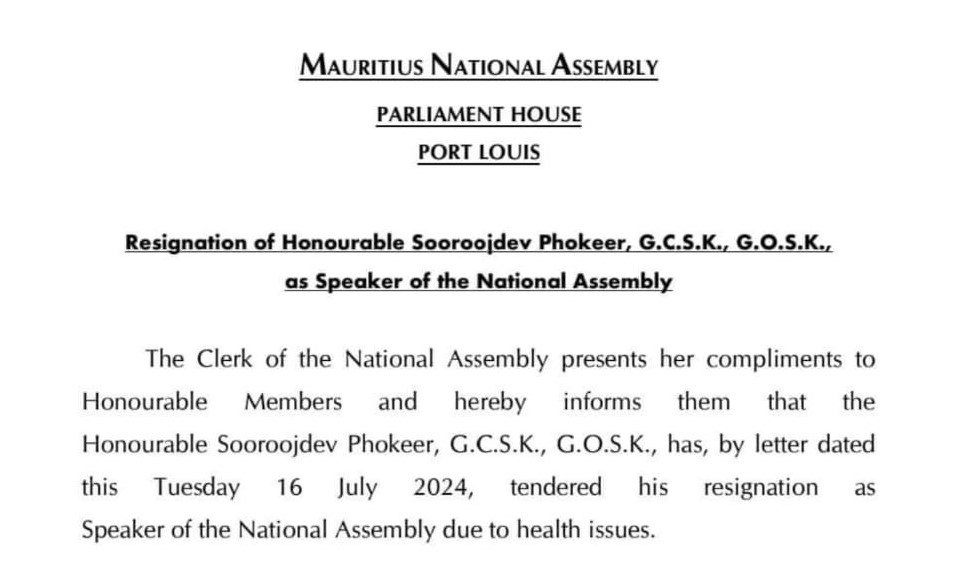 La nouvelle était attendue. Le Speaker de l’Assemblée nationale, Sooroojdev Phokeer, a soumis sa démission en début de soirée ce mardi pour des raisons de santé. C’est ce qui ressort d’un communiqué émis par l’Assemblée nationale ce 16 juillet. Sooroojdev Phokeer est actuellement admis à la Cardiac Unit de l’hôpital Candos. Le Premier ministre, Pravind Jugnauth, qui lui a rendu visite cet après-midi, a déclaré : « Le Speaker a eu des problèmes de santé, les traitements se passent bien ». L’ancien Speaker de l’Assemblée nationale est actuellement malade et a été admis à l’unité de cardiologie de l’hôpital Victoria. Malgré son état de santé, il a continué à subir les foudres et la haine de l’Opposition et de plusieurs internautes.